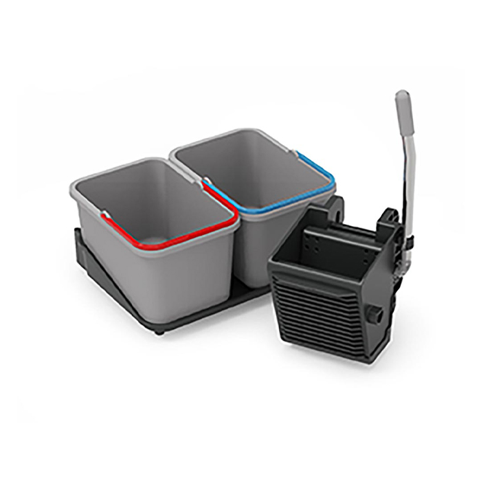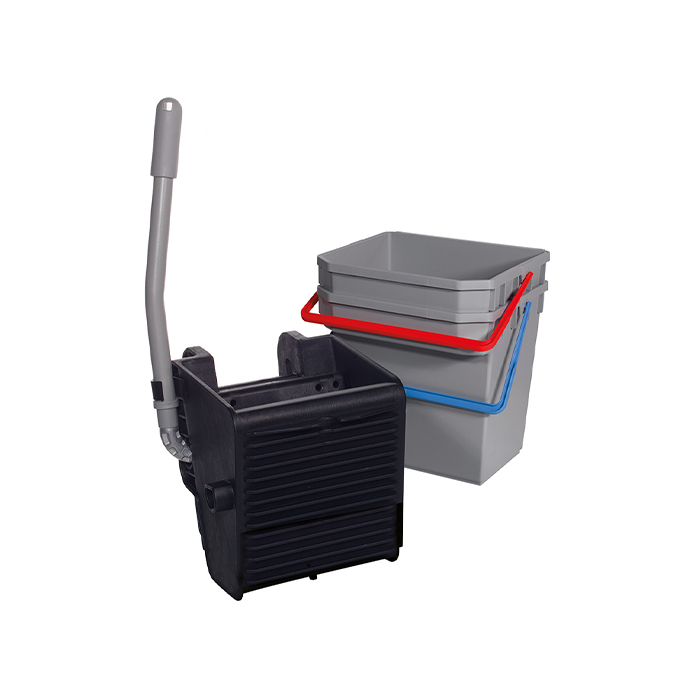 Carrello lavapavimenti con doppio secchio e pressa verticale.